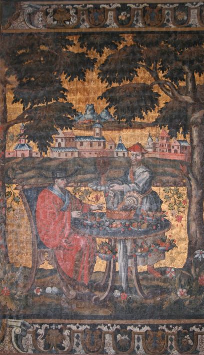 På tæpperne ses slægtens mange herregårde, omgivet af voldgrave og placeret midt i et landskab med ryttere, bønder og kareter.