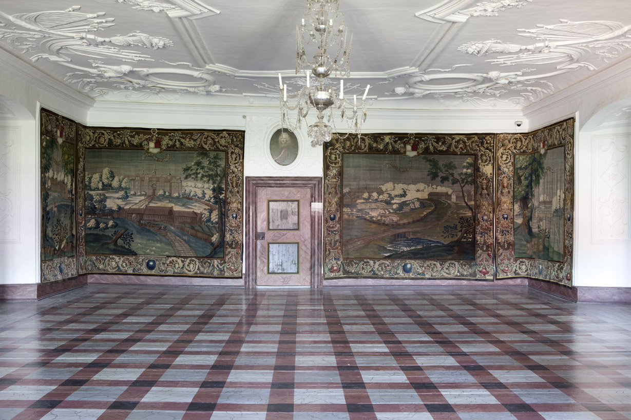I den nye riddersal, hvor stukloftet er befolket med heste og soldater omgivet af militærsymboler, blev de syv store vævede tæpper, som Christen Skeels fader og moder, Jørgen Skeel og Benedicte Brockdorff, havde bestilt 20 år før, hængt op.