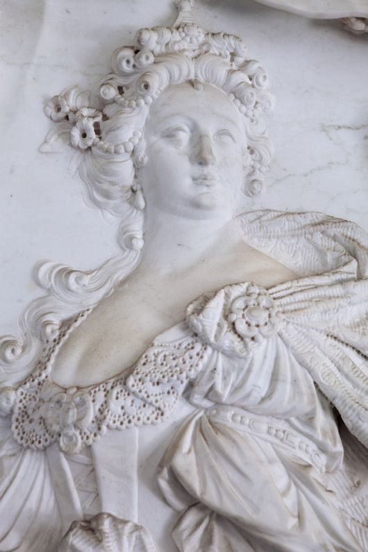 Relieffet, som Jørgen Skeel med en let håndbevægelse præsenterer, er et prægtigt portræt af Benedicte Brockdorff, den nybagte stammoder placeret som en sol i gravmælets centrum.