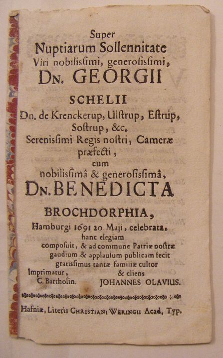 Uanset hvad forhistorien var: De barokke vers fra deres bryllup i 1691 fremstiller Benedicte Brockdorff som Jørgen Skeels frelsende engel, et plaster på såret.