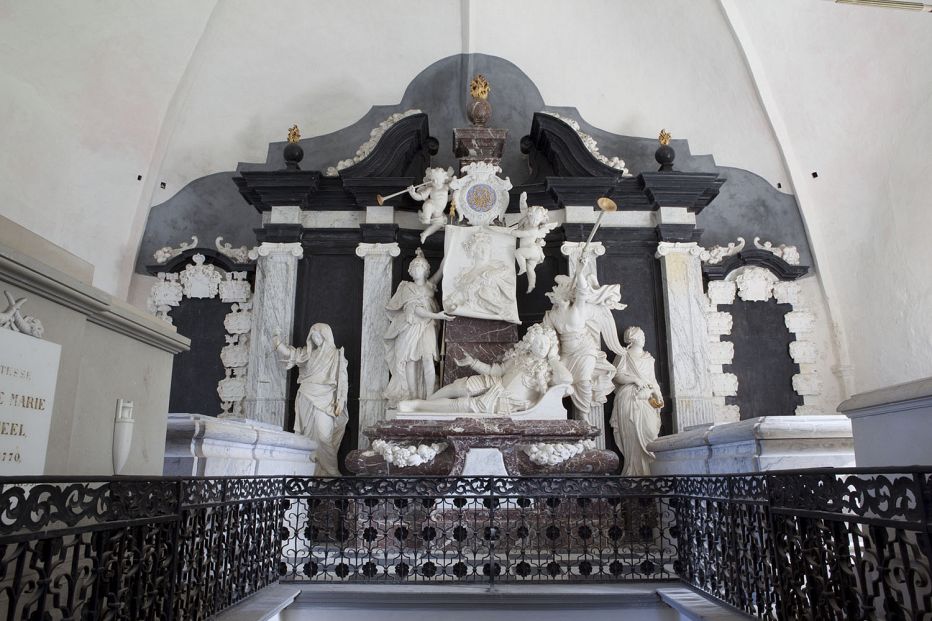 Gravmælet, der er skabt af billedhuggeren Thomas Quelinus, er udført i hvid, rød og sort marmor.