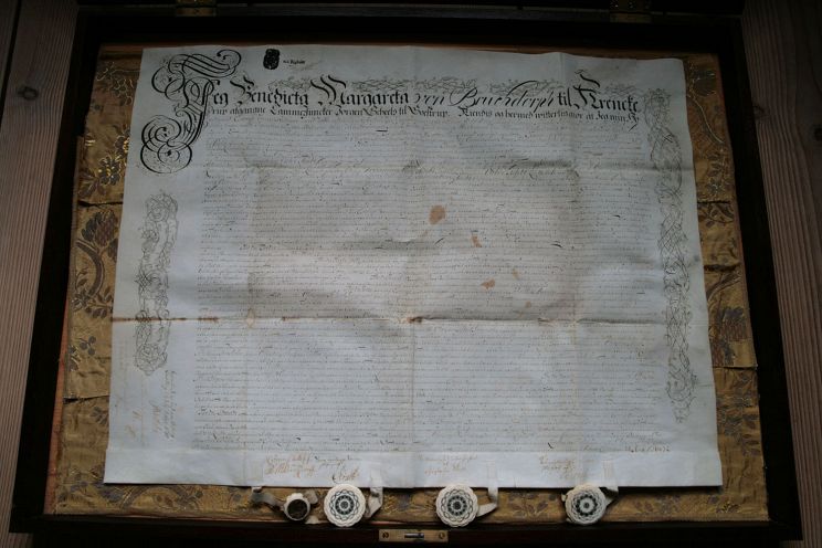 Alt er bevidnet og underskrevet af Otto Krabbe til Holmegård, der var gift med Birgitte Skeel til Vallø.