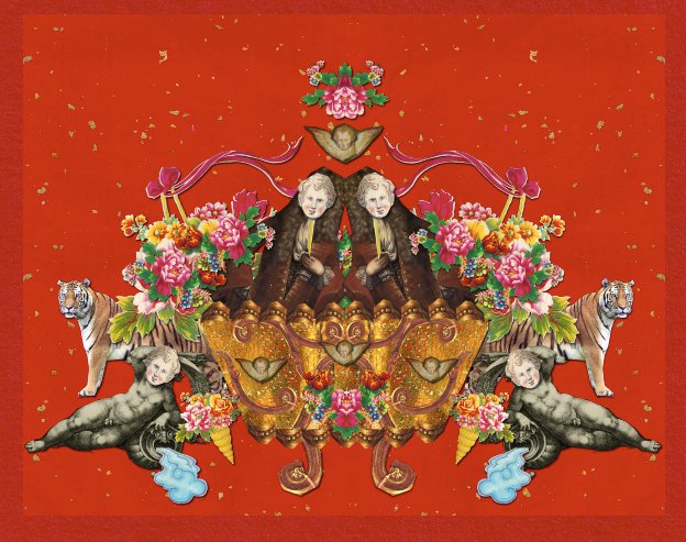 Flyvende engle peger op mod et slynget monogram, der i fire meters højde toppes af en forgyldt flamme.