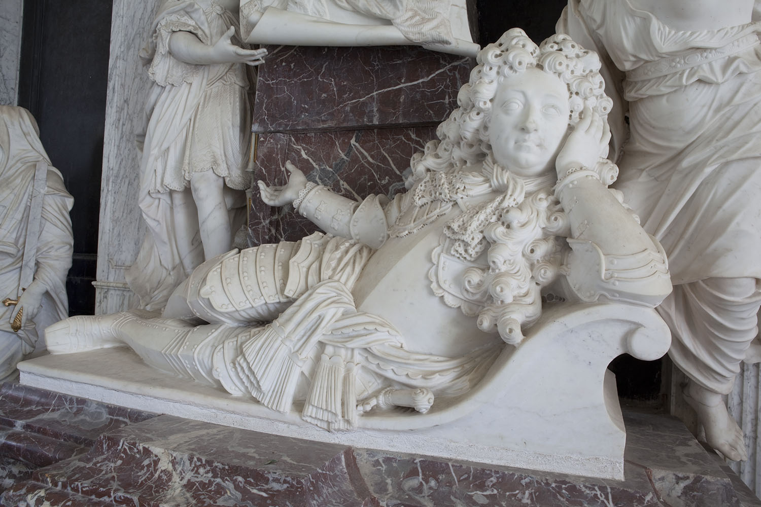 Dydefigurerne ”Retfærd” og ”Mådehold” vogter gravmælets sider, og frem bag Jørgen stormer ”Berømmelsen” med guldbelagt trompet.