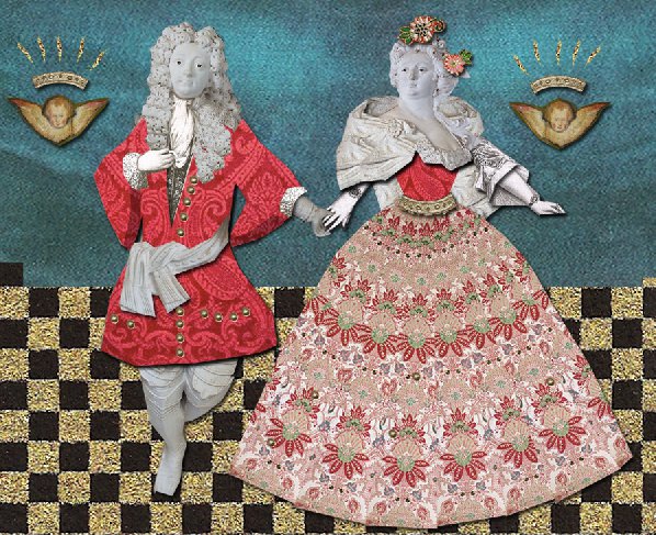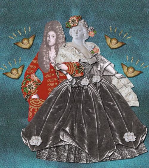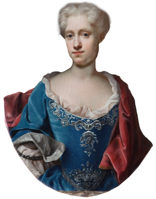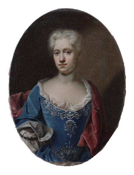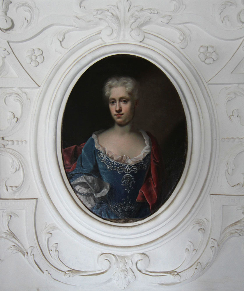I stukken over dørene i Riddersalen var der plads til portrætter af Christen Skeel og hustruen Augusta Winterfeldt. Hun er i blåt, og han har langt udslået hår.