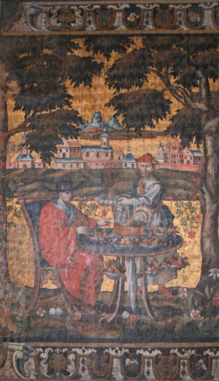 På Gammel Estrup dekoreredes et rum i øverste stokværk fra gulv til loft med lærreder dækket med stuk og bemalet med motiver, hvor rige kinesiske købmænd lever livet.
