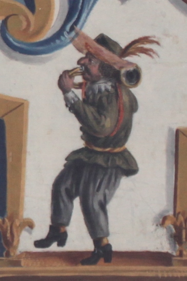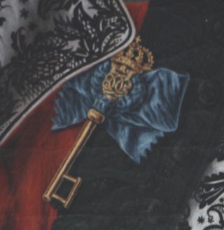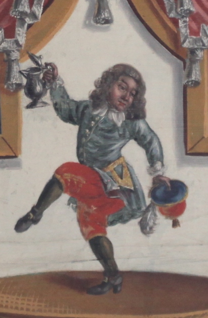 Jørgen Scheel er i ført dannebrogriddernes ordensdragt med den tilhørende store kappe og ridderkorset på brystet. Dertil broderede silkestrømper og fine sko med røde hæle - et prestigetegn, som kun adelige måtte bære.