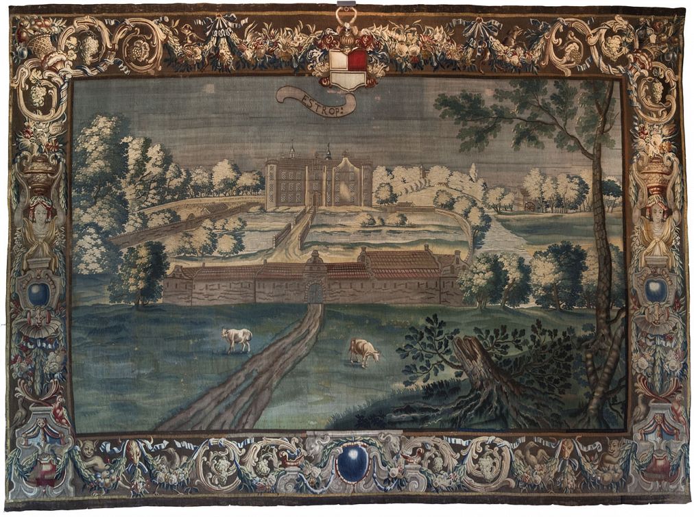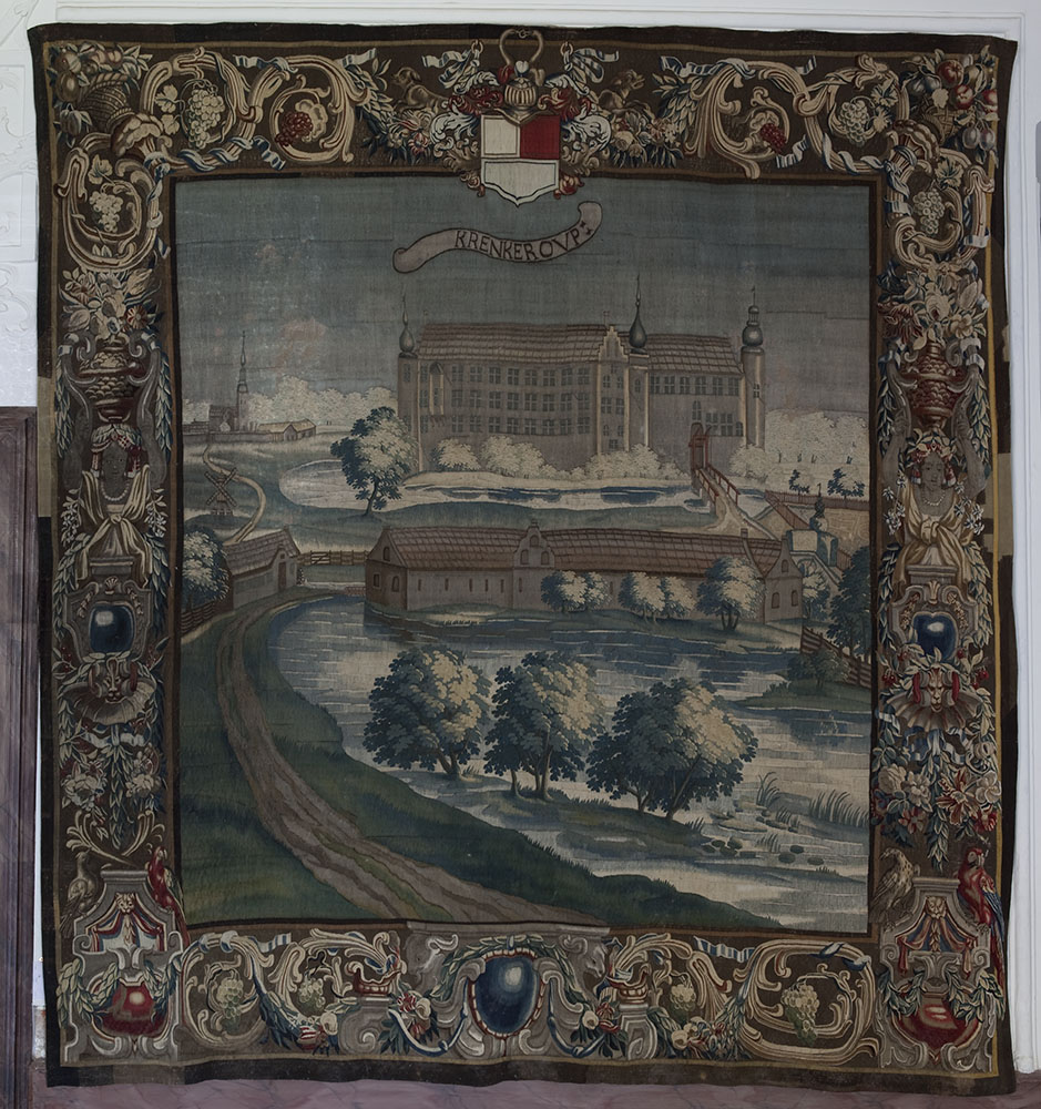 To ud af de otte gobeliner over Jørgen Skeels besiddelser. Øverst Gammel Estrup. Til højre Krenkerup.
