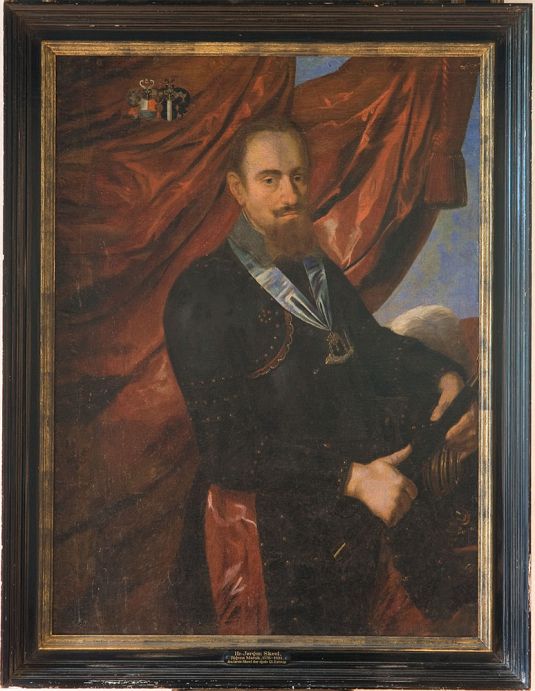 Jørgen Skeel lod sig male i pragtfuld rustning og med marskalstaven og ordenen Den væbnede Arm i blåt silkebånd om halsen. Jørgen Skeel stod ved sin fascination af sin ungdoms helte: Skægget har samme form som det, der blev båret af den berømte franske krigerkonge Henrik IV.