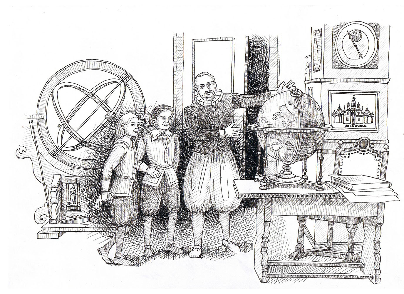 Måske har Jørgen Skeel været på Uranienborg som barn. Her kunne han se onkel Tychos mærkelige instrumenter, modellerne af verdensrummet og det fantastiske byggeri.