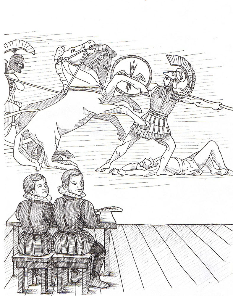 Da de rykkede op i næste klasse, begyndte de at digte på latin og skrive små breve. De efterlignede de gamle romerske digtere, og de læste om krigen i Troja og spillede rollespil. Jørgen var måske helten Achilleus, mens Otte var Paris. På Rigsarkivet kan man se Jørgens latinbog, hvor han har skrevet sine lektier, små ordsprog og grammatiske øvelser med brunt blæk.
