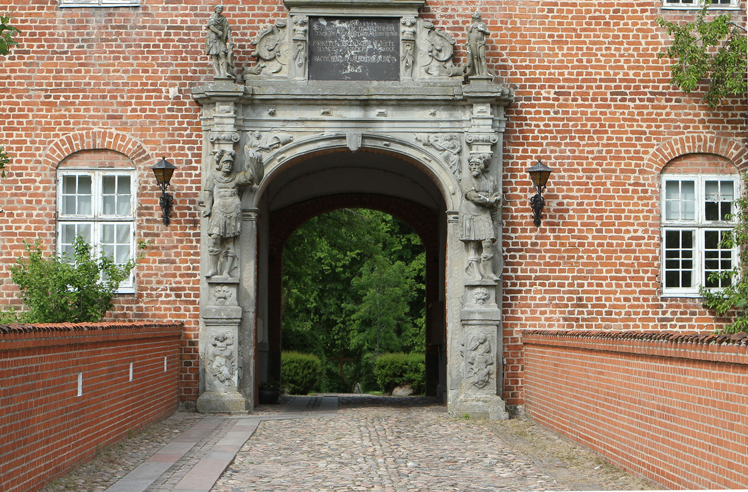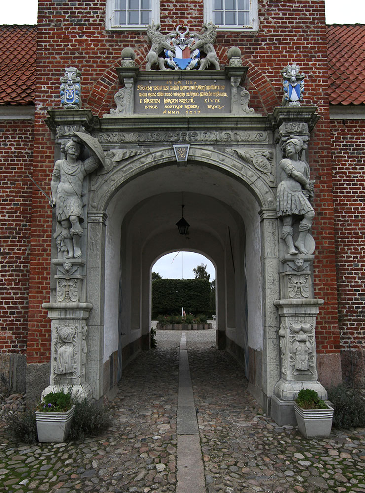 To af Jørgen Skeels romerske helte forsvarer porten. Den ene, Horatius Cocles, er ved at trække sit sværd mens Titus Manlius har hævet sit skjold. På Sostrup satte Jørgen Skeel i 1626 en lignende portal op.
